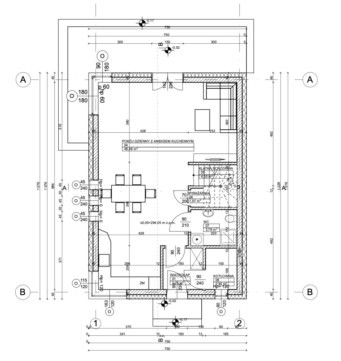 – parter: salon z aneksem kuchennym o pow. 48 m.kw., wiatrołap, łazienka, kotłownia, klatka schodowa;