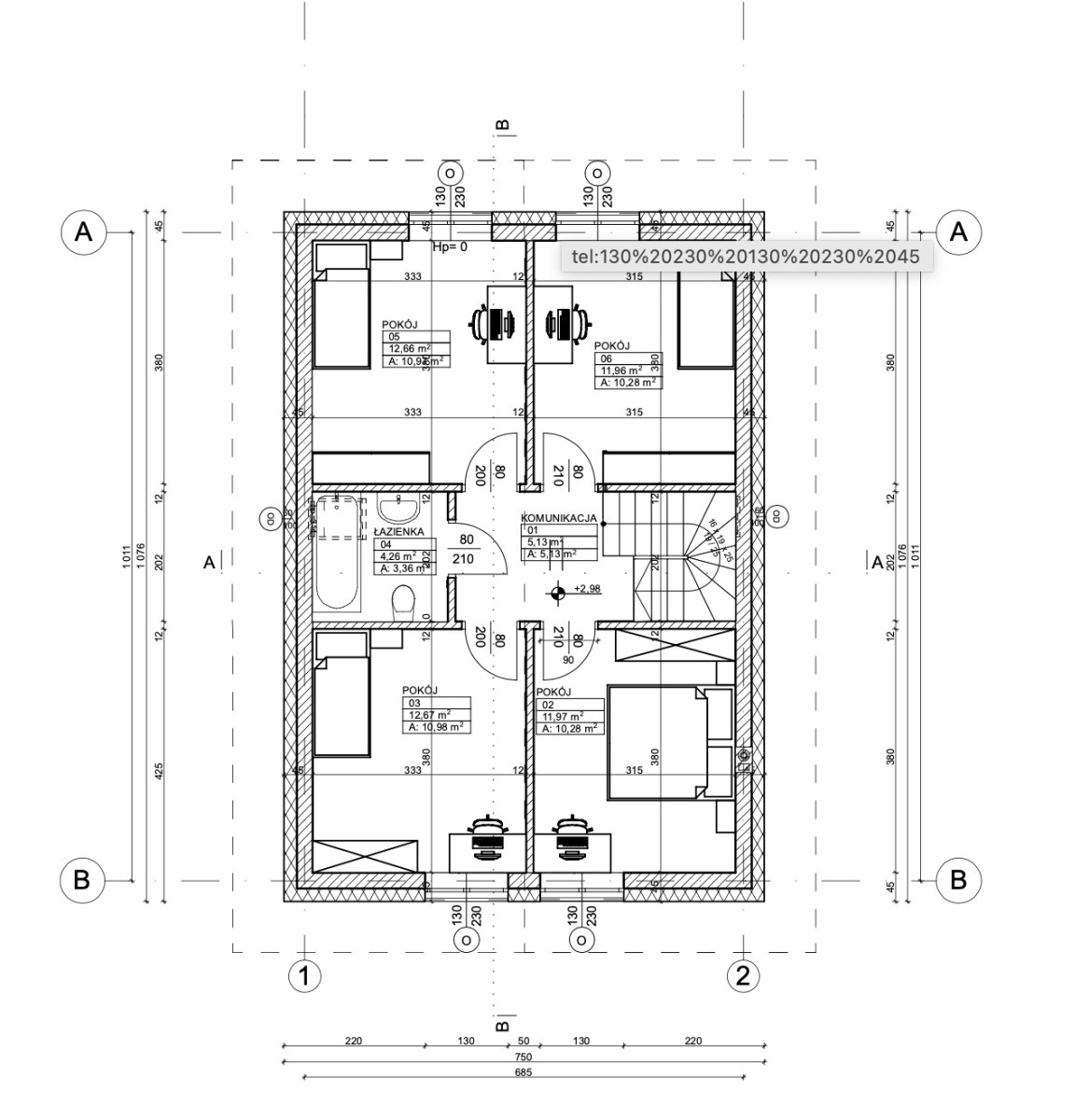 – poddasze: 3 pokoje, łazienka, komunikacja, wyłaz na strych.