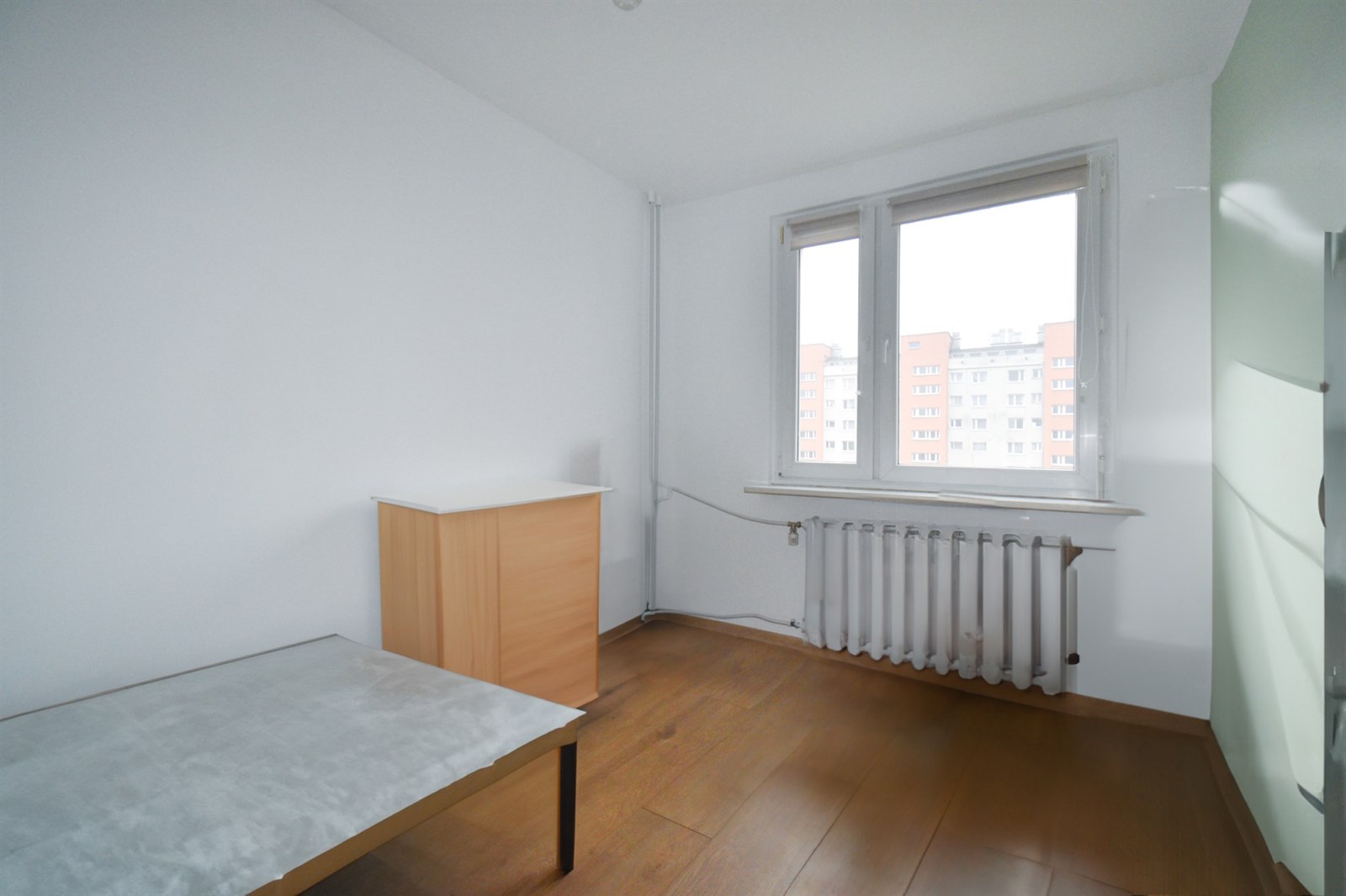 W pokoju łóżko pojedyncze, komoda, regał, biurko, krzesło, szafa. W łazience – pralka, prysznic, umywalka z szafką, lustro, grzejnik drabinkowy. W Toalecie – WC, szafka z umywalką i wisząca szafka. Kontrola dostępu: domofon.