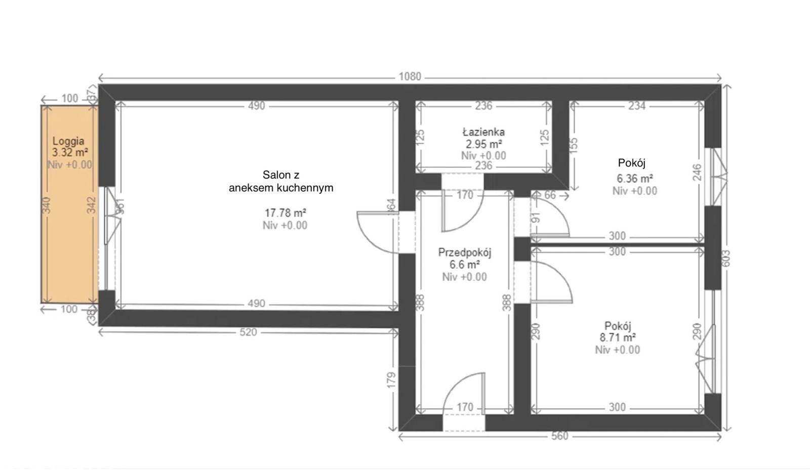 - salon z aneksem kuchennym – 17,8 m²