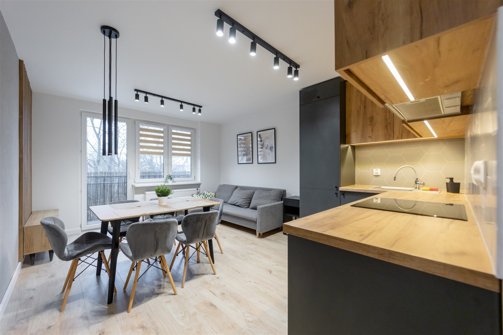 Wnętrze urządzone w ponadczasowym stylu: ciepłe drewno, eleganckie szarości, jasne przestrzenie.